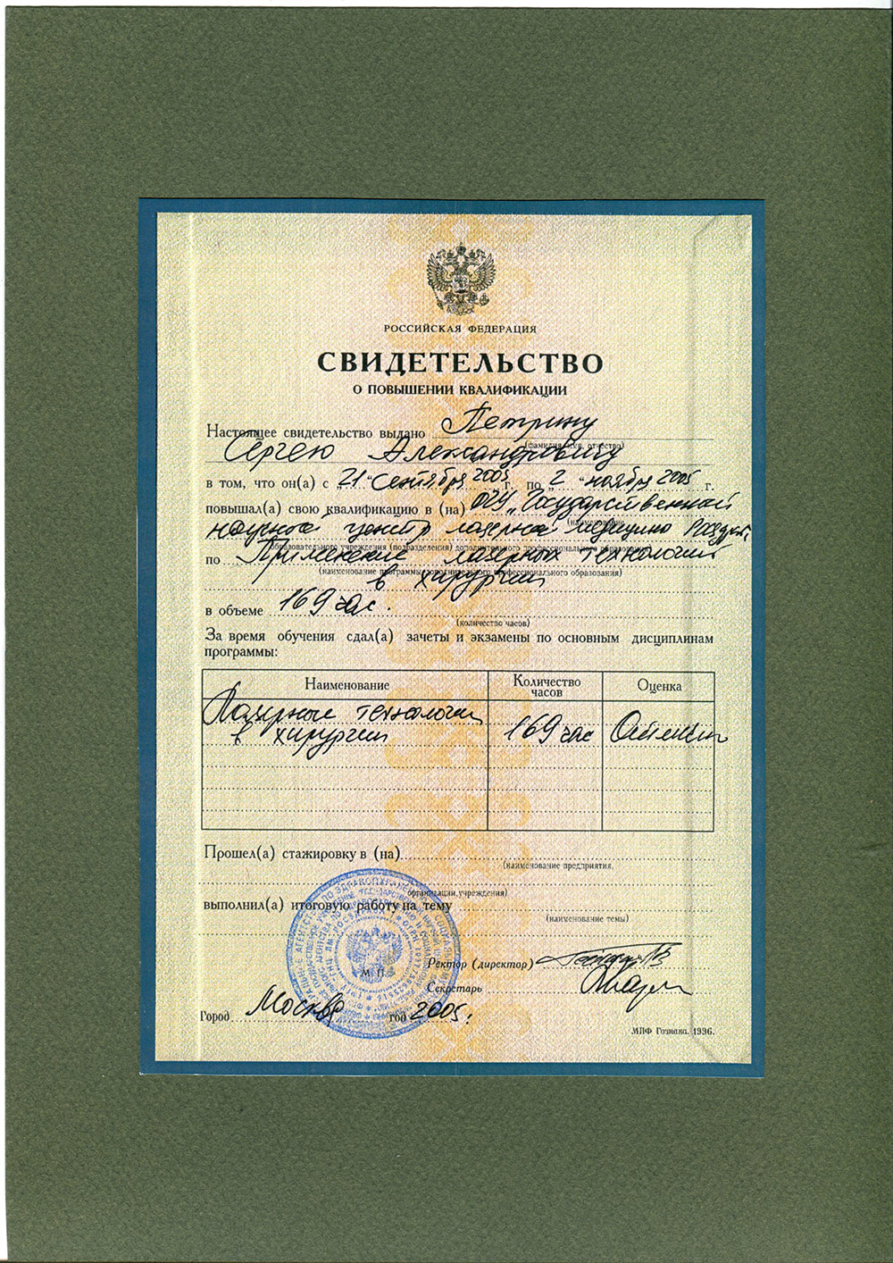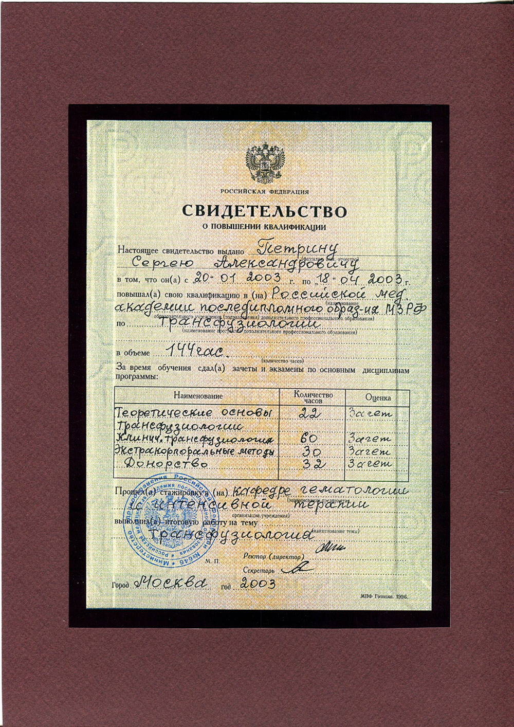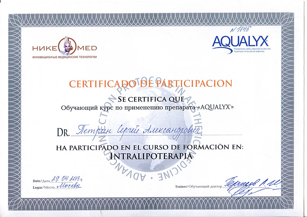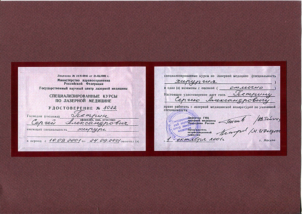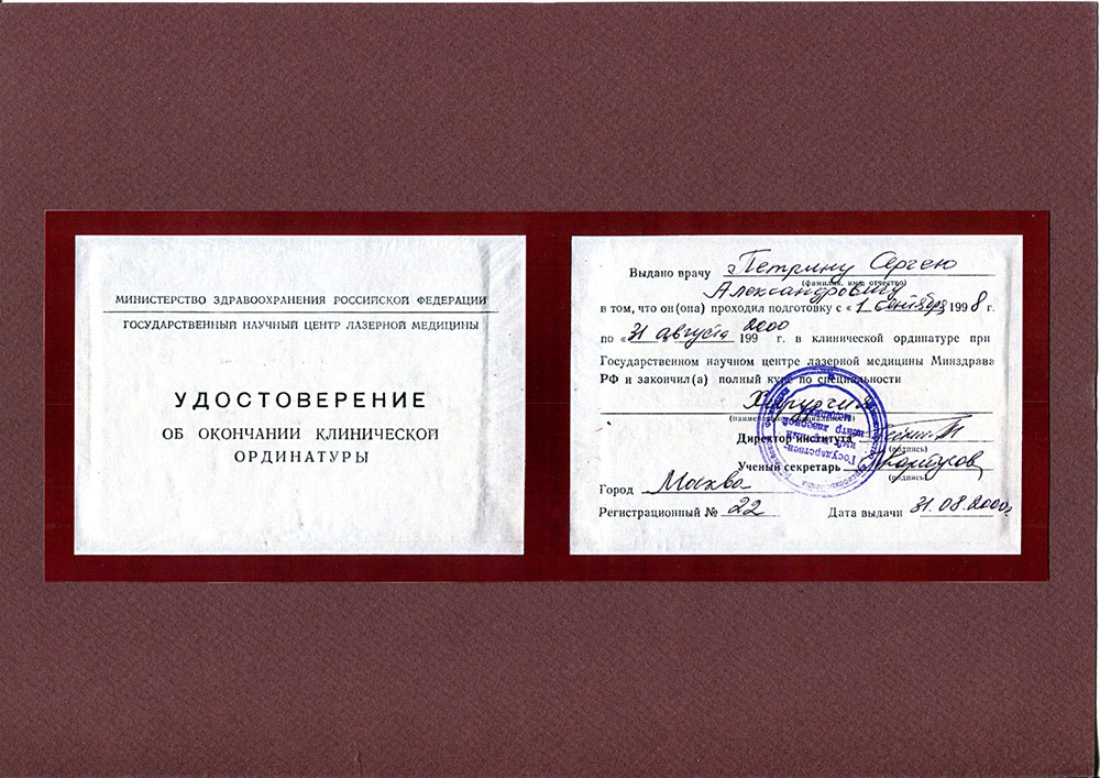 Сертифицированный специалист по лазерным технологиям в медицине. Научный эксперт фонда «Сколково» по медицине и биотехнологиям.Действующие сертификаты: "Пластическая хирургия", "Организация здравоохранения и общественное здоровье", "Хирургия".