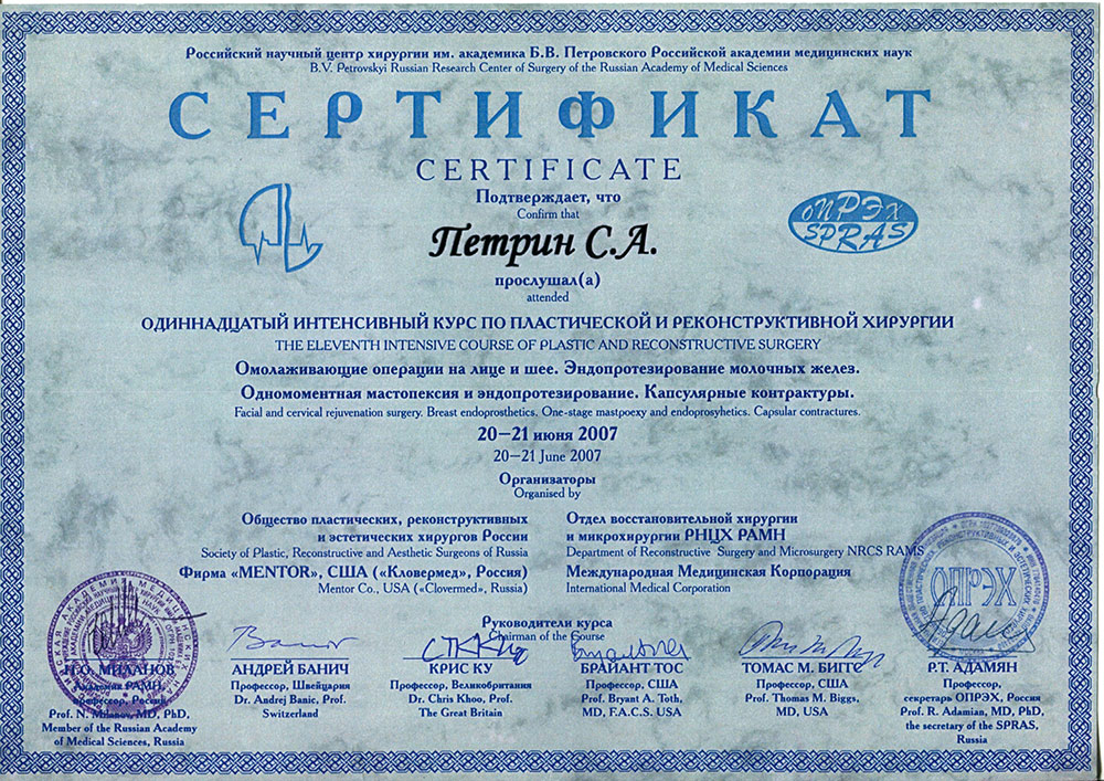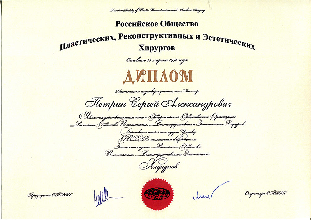Член международной конфедерации пластических, реконструктивных и эстетических хирургов IPRAS. Сертифицированный специалист в области пластической хирургии.